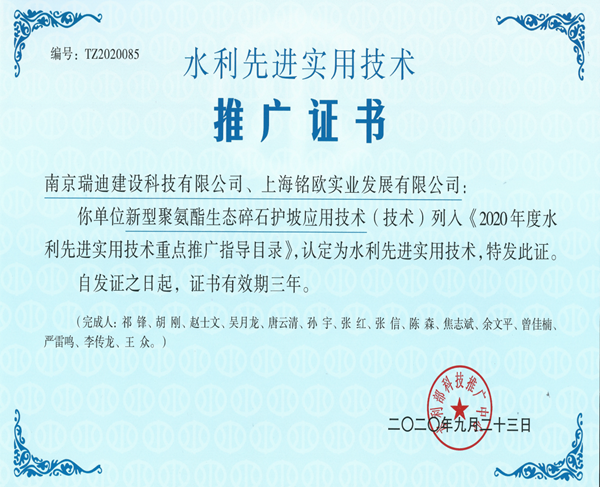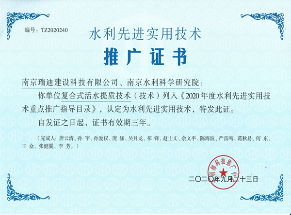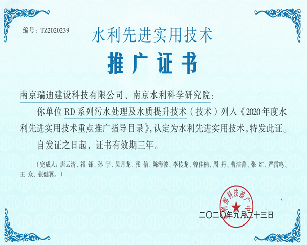日前,水利部科技推广中心公布了《2020年水利先进实用技术重点推广指导目录》,瑞迪科技集团与南京水科院联合申报的《RD系列污水处理及水质提升技术》和《复合式活水提质技术》、与上海铭欧实业发展有限公司联合申报的《新型聚氨酯生态碎石护坡应用技术》共3项成果入选本年度《水利先进实用技术重点推广指导目录》。