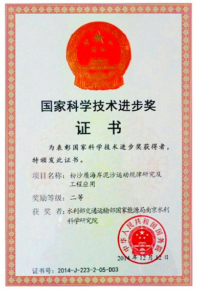 2015年1月9日,中共中央、国务院在人民大会堂隆重召开2014年度国家科学技术奖励大会,我院作为主持单位之一完成的“粉沙质海岸泥沙运动规律研究及工程应用”获国家科学技术进步二等奖。