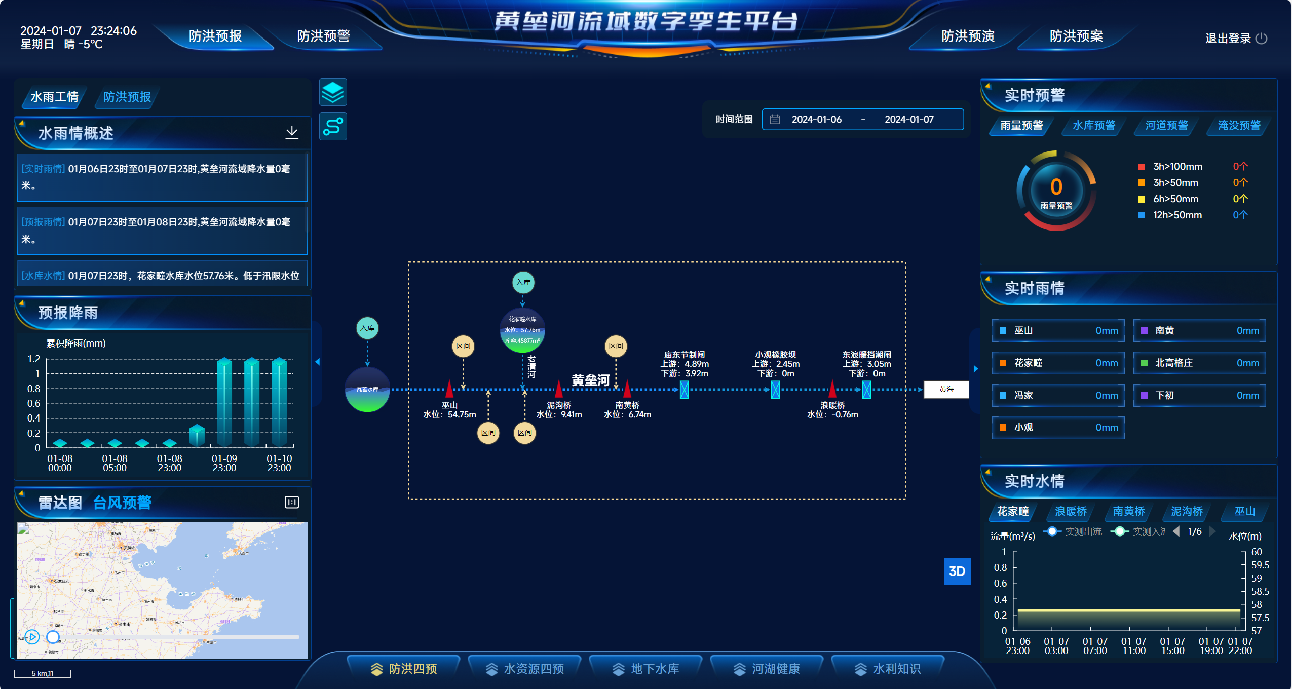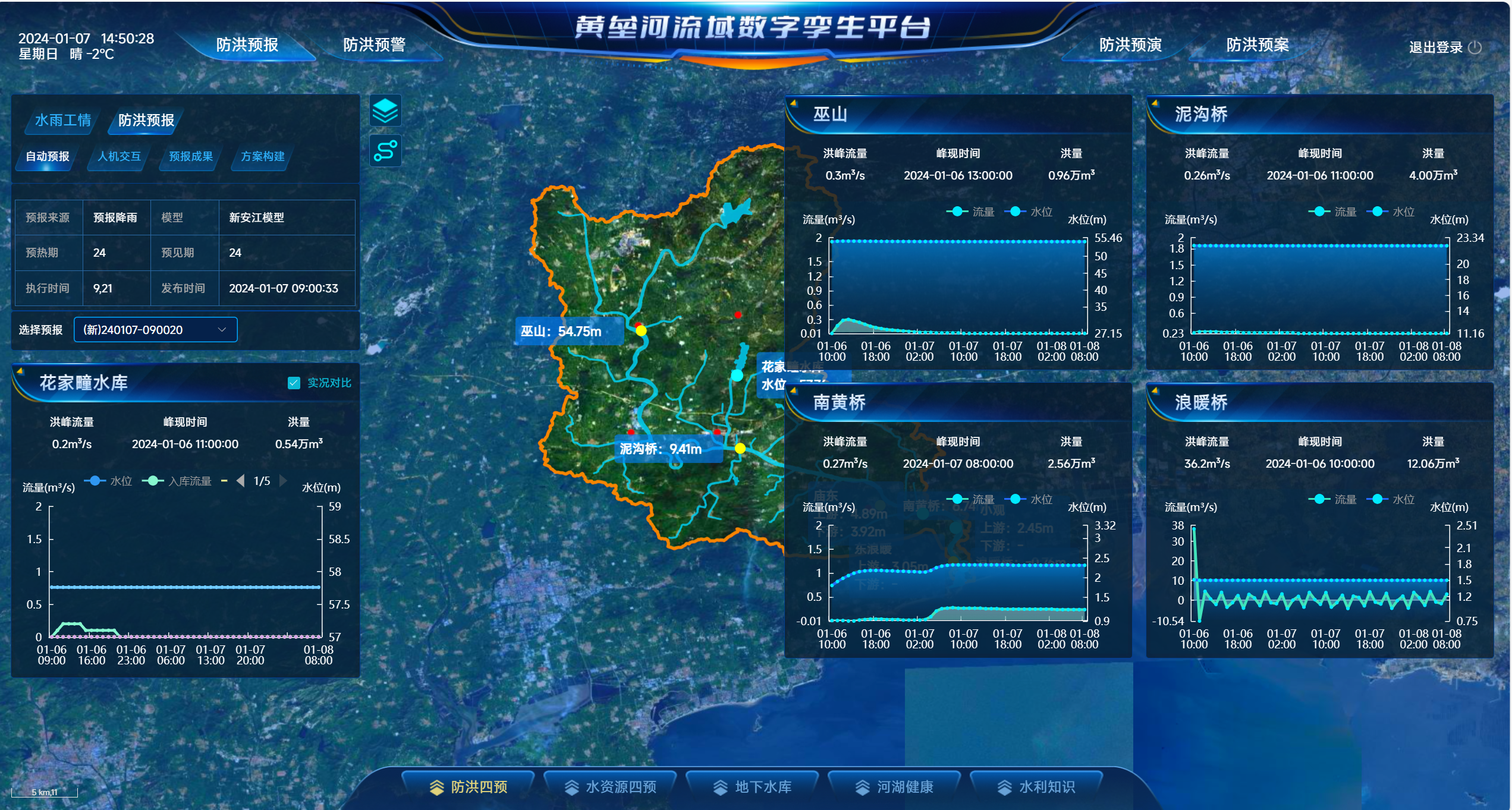 研究成果也已经成功应用于“黄垒河流域数字孪生平台”研发建设。利用雨水情监测预报“三道防线”,系统掌握流域“空中雨、落地雨、水文站”实时与预报信息,研发气象水文耦合洪水预报技术,洪水预见期延长了24小时,报汛时段缩短至1小时。建立了由临界雨量、水库-河道水位、洪水淹没水深组成的分类分级预警指标,实现暴雨、洪水、演进、淹没全过程预警。